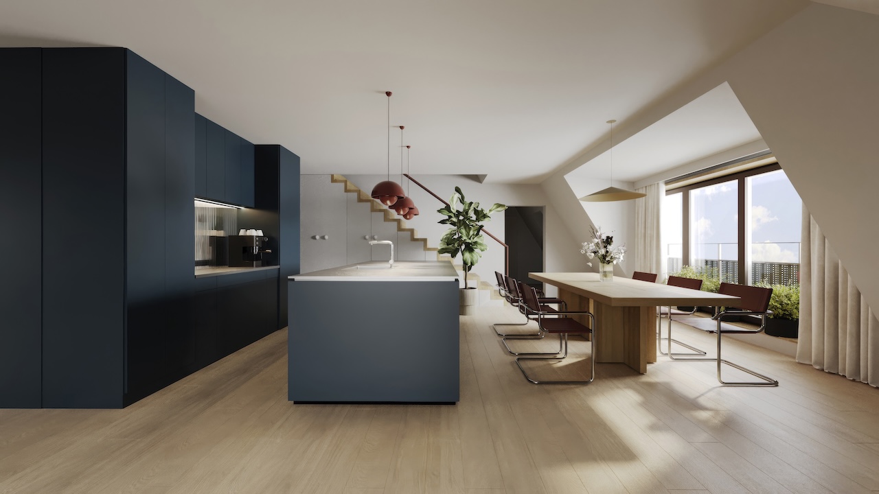 Die Dachwohnung 501 ist das Highlight des Hauses. Mit 157 m² (ab Kniestock) bietet sie flexible Grundrisslösungen als 4½- oder 3½-Zimmerwohnung. Der grosszügige Wohn- und Essbereich geht über eine interne Treppe in die exklusive Dachterrasse mit Pergola über – eine Oase mitten in der Stadt. Leben über den Dächern von Wipkingen bedeutet hier: Aussicht, Ruhe und ein Maximum an Privatsphäre. Mit dem Lift direkt in die Wohnung, zwei grosszügige Schlafzimmer, zwei Badezimmer, und ein Reduit machen diese Attika zu einem einzigartigen Zuhause.
